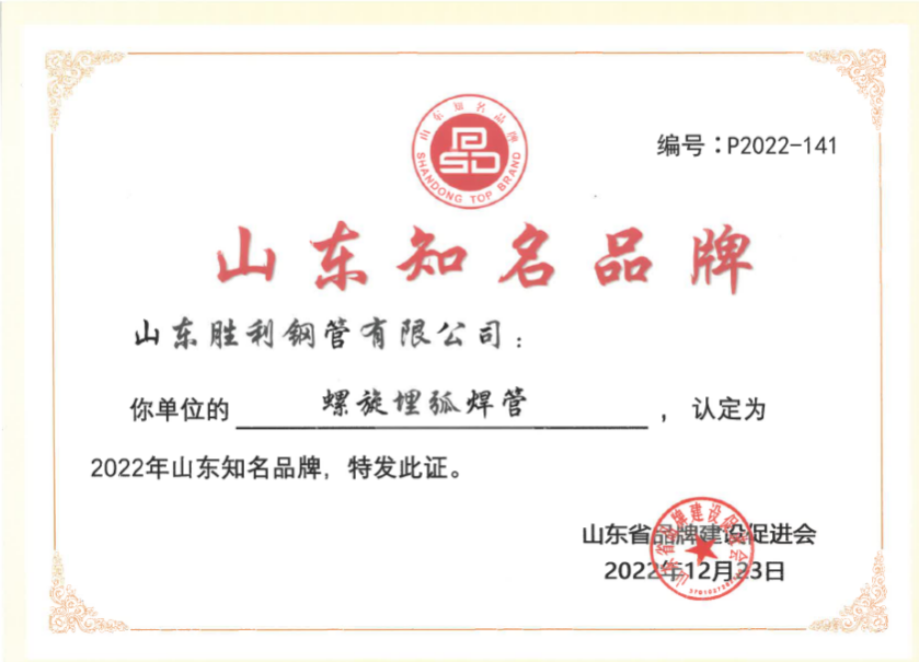 山東勝利螺旋埋弧焊管產(chǎn)品順利通過2022年度“山東知名品牌”榮譽(yù)認(rèn)證。2022年7月26日認(rèn)證工作啟動(dòng)后,公司積極參加認(rèn)證工作,認(rèn)真組織各項(xiàng)申報(bào)材料,登錄認(rèn)證平臺(tái)提交申報(bào)材料,并承諾確保申報(bào)材料的真實(shí)性、準(zhǔn)確性和有效性?!吧綎|知名品牌”榮譽(yù)的獲得,將大大有助于公司螺旋埋弧焊管進(jìn)一步拓寬省內(nèi)外銷售市場(chǎng),有助于爭(zhēng)取更多的社會(huì)市場(chǎng)訂單。