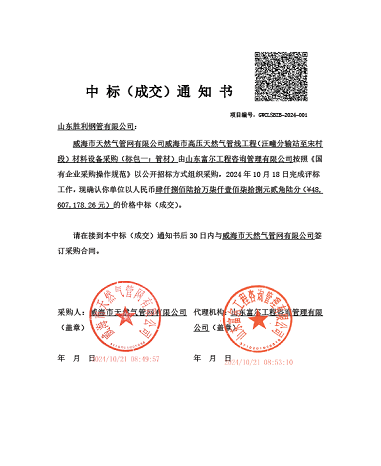 ??近日,山東勝利成功中標(biāo)了威海市高壓天然氣管線工程(汪疃分輸站至宋村段)材料設(shè)備采購的項目,該項目總量8000余噸,標(biāo)志著公司在市場競爭中再次取得了顯著成果,實力得到了市場的廣泛認(rèn)可。